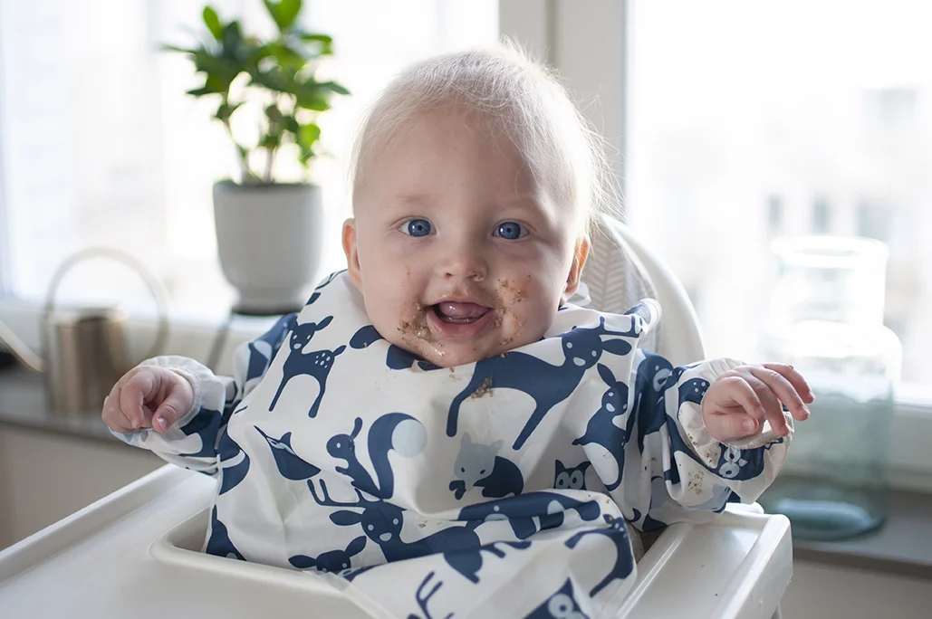 Många föräldrar oroar sig för om barnet äter tillräckligt, men vi får inte glömma att alla barn är olika och har kommit olika långt i sitt smakäventyr och det är okej. Jag tror att det viktigaste är att långsamt vänja de små magarna med riktigt mat och fortsätta ge bröstmjölk/ersättning det första året. Börja med pyttesmå smakprover av mat, ca ett kryddmått bara. Svenska Livsmedelsverkets råd är att börja med detta tidigast från fyra månaders ålder. T ex låta bebisen smaka på just det du själv äter. Doppa ditt finger i potatismoset eller i såsen och ge. Förr tuggade ofta föräldern själv maten och gav bebisen. När Alfred var fem månader började vi trappa upp portionen på maten. Detta gjorde vi i samråd med vår BVC-sköterska, då han var nyfiken på mat samt i hopp om att han skulle sova bättre på natten – vilket han också gjorde. Han valde själv att sluta äta helt på natten efter detta. Här kan man göra på olika sätt, anpassa efter ditt barn, men det jag tyckte funkade bra var att ge ersättning/bröstmjölk till mellis och mat på typiska tider för frukost, lunch och middag. Då var han heller inte superhungrig när vi skulle äta, vilket är en rätt bra förutsättning för att ha en glad unge vid matbordet. Ungefär så här såg vårt matschema ut: